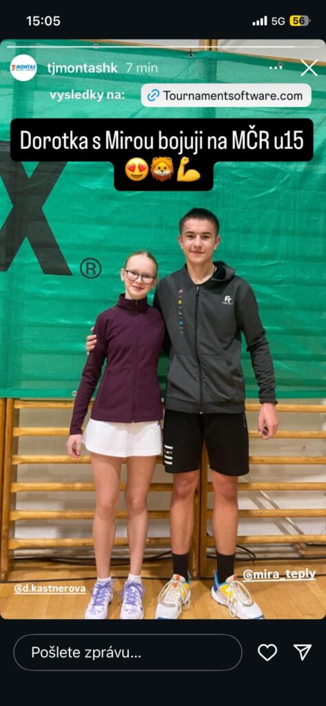 V sobotu 22.11. začalo v Orlové MČR kategorie do 15 let. Dorotka Kastnerová a Míra Teplý nás odjeli reprezentovat a skvěle se jim zdařilo. Dorotka s Valčou Burgetovou z Pardubic získaly titul Mistrýně ČR v deblu a Dorotka ještě přidala stříbro s Márou Zaňkou z BR Rychnov, Ani Míra Teplý nezůstal v medailích pozadu a získal bronzový hattrick, V deblu s Kyzlíkem a v mixu s Perníkovou. Moc gratulujeme.